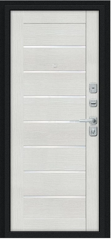 Надежная входная Дверь Браво Техно/BChrome Букле черное/Bianco Melinga премиум класса по цене 36 379 руб. Большая толщина стали защитит от проникновения в ваш дом, квартиру или коттедж. Используется очень качественная фурнитура: замки, цилиндры, ручки, защелки. Покрытие и отделка двери изготовлено под внимательным контролем производителя. Дверь имеет долгий срок службы и гарантию.